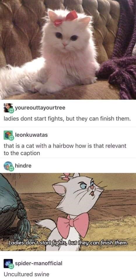 Aristocats, aristocats marie, ladies don't start but can finish, ladies. Ladies dont start fights but they can finish them. We don't know when or if this item will be back in stock. Defend women at all costs, including with your own life. Meme generator the fastest meme generator on the planet.